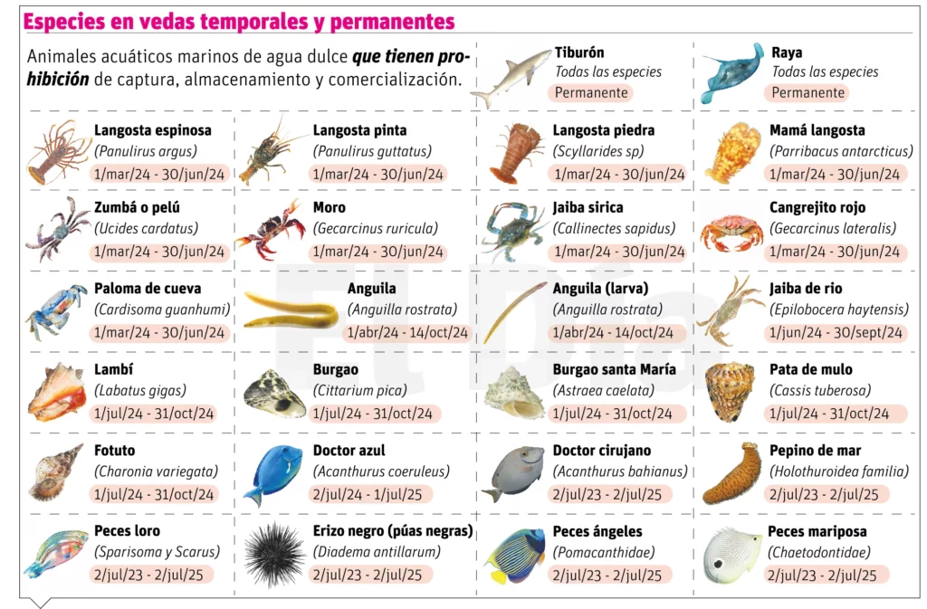 Algunas son de importancia capital en término económico y frente a esa disyuntiva el Ministerio de Medio Ambiente y Recursos Naturales, así como el Consejo Dominicano de Pesca y Acuicultura (Codopesca) alertan en esta temporada sobre la veda o prohibiciones establecidas en el Decreto 281-23 para diversas especies.