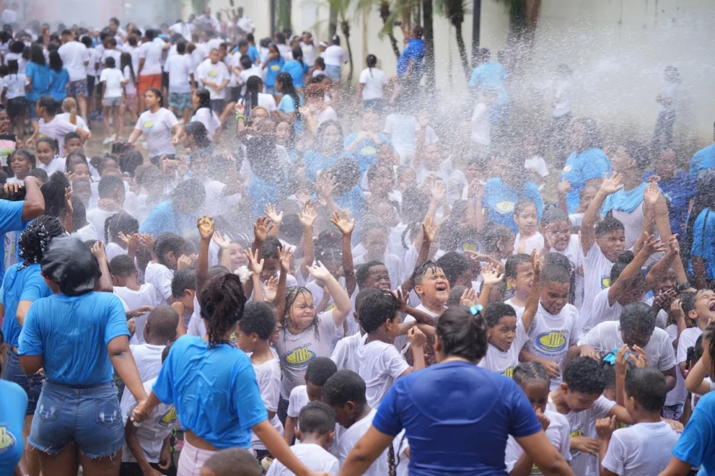 Al finalizar la charla, los cientos de campistas pudieron disfrutar un refrescante momento, al recibir un baño por varias unidades de los camiones de bomberos en la explanada frontal de la Fundación Mauricio Báez.