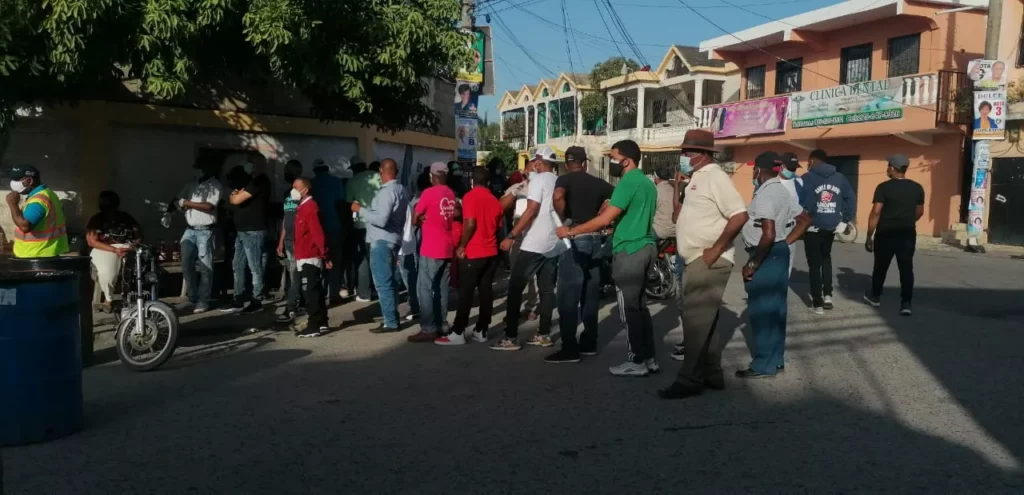 Con mascarillas, en su mayoría bien puestas (y algunas con guantes), los votantes hacen un esfuerzo inútil por mantener la distancia de un metro recomendada, por lo que los agentes de la armada y oficiales de la Junta Central Electoral deben recordar constantemente la necesidad de mantener el distanciamiento.
