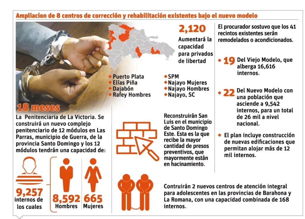 Los ocho centros de Corrección y Rehabilitación del Nuevo Modelo serán ampliados conforme a las necesidades. Esta intervención del Ministerio Público se producirá en Puerto Plata, Elías Piña, Dajabón, Rafey Hombres Santiago, San Pedro de Macorís, Najayo Mujeres, Najayo Hombres y Najayo, en San Cristóbal.