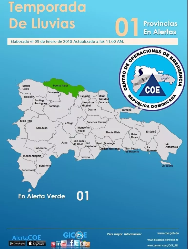 Santo Domingo.- El Centro de Operaciones de Emergencias (COE), mantiene la provincia Puerto Plata en alerta verde por posibles inundaciones repentinas urbanas y rurales, crecidas de ríos arroyos y cañadas, así como deslizamientos de tierra.