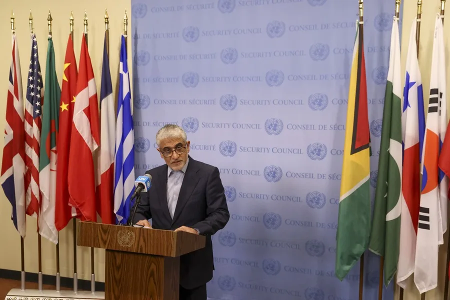 Iravani, en una declaración a la prensa delante del Consejo de Seguridad, Iravani denunció los recientes ataques de Israel que han dejado decenas de civiles muertos como «crímenes de guerra», incluido el de la radiotelevisión pública iraní (IRIB) de hoy, que calificó como un «asalto directo a la libertad de prensa».