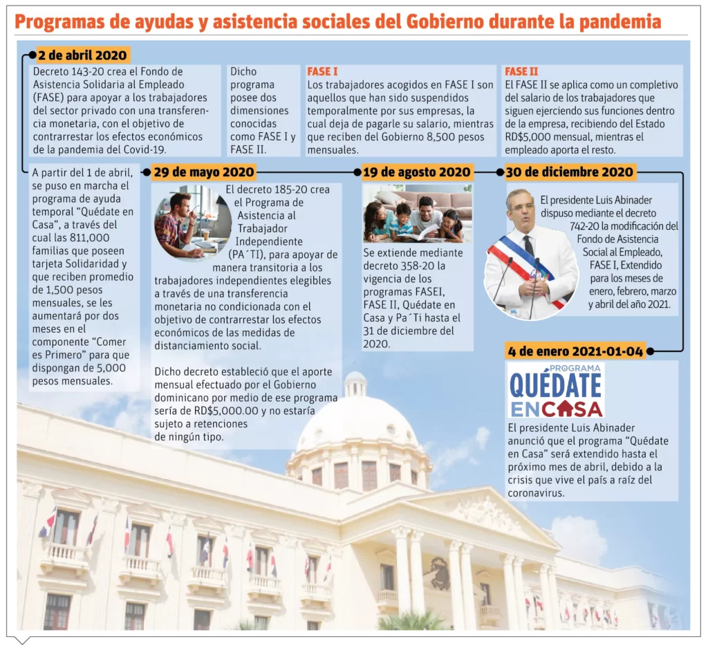 De su lado, el ministro de Hacienda, José Manuel Vicente, explicó que la extensión de los programas “Quédate en Casa” y “FASE I”, anunciada la semana pasada, contempla un monto de 27 mil millones de pesos, unos 17 mil millones contenidos en el actual Presupuesto y otros 10 mil millones adicionales que saldrán de partidas no prioritarias relacionadas con publicidad y la liquidación de la Corporación Dominicana de Empresas Eléctricas Estatales.
