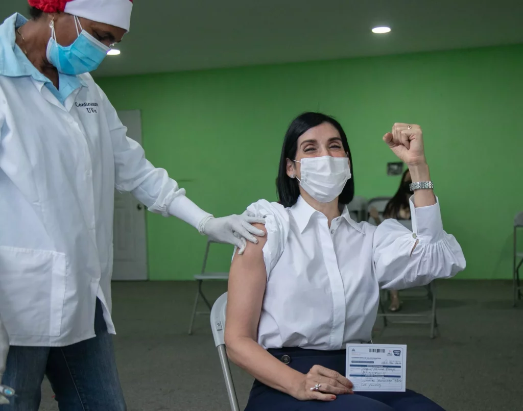 SANTO DOMINGO.- La primera dama Raquel Arbaje recibió este lunes la primera dosis de la vacuna contra el Covid-19, en un puesto ubicado en el sector de San Carlos.
