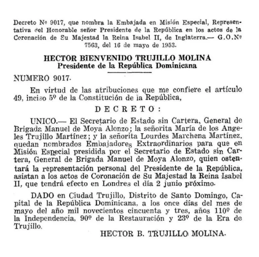 "El secretario de Estado sin cartera, general de Brigada Manuel de Moya Alonso; la señorita María de los Angeles Trujillo Martínez; y la señoritta Lourdes Marchena Martínez, quedan nombradas embajadores extraordinarios para que en misión especial presidida por el secretariode Estado sin cartera, general de Brigada Manuel de Moya Alonso, quien ostentará la representación personal del presidente de la República, asistan a los actos de coronación de su majestad de la Reina Isabel ll, que tendrá efecto en Londres el día 2 de junio próximo", establecía el decreto, emitido el 11 de mayo de 1953.