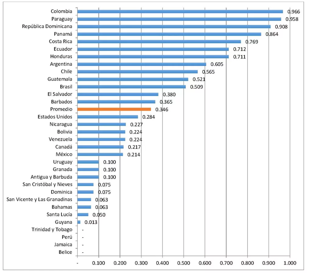 En cuarto lugar en el ranking figura Panamá con 0,864, Costa Rica con 0.769, Ecuador 0, 712, Honduras con 0,711 y Argentina con 0,605.