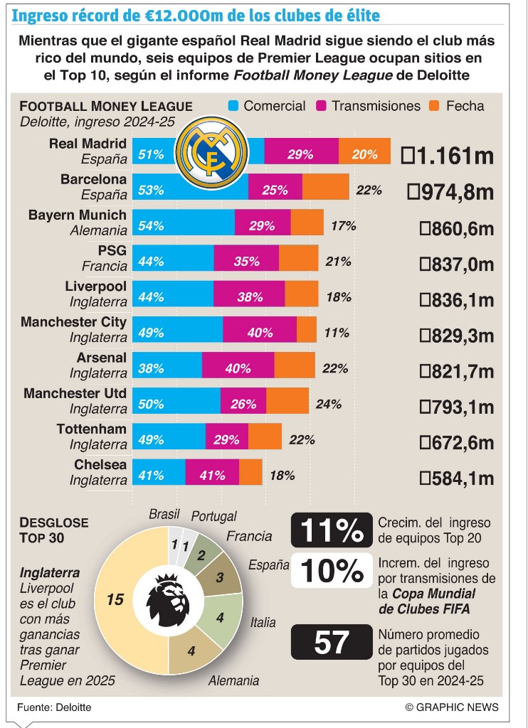 Madrid, España.-Real Madrid y Barcelona fueron los dos equipos con mayores ingresos a nivel mundial en la temporada 2024-2025, según recoge el informe 'Deloitte Football Money League' en su vigésima novena edición.