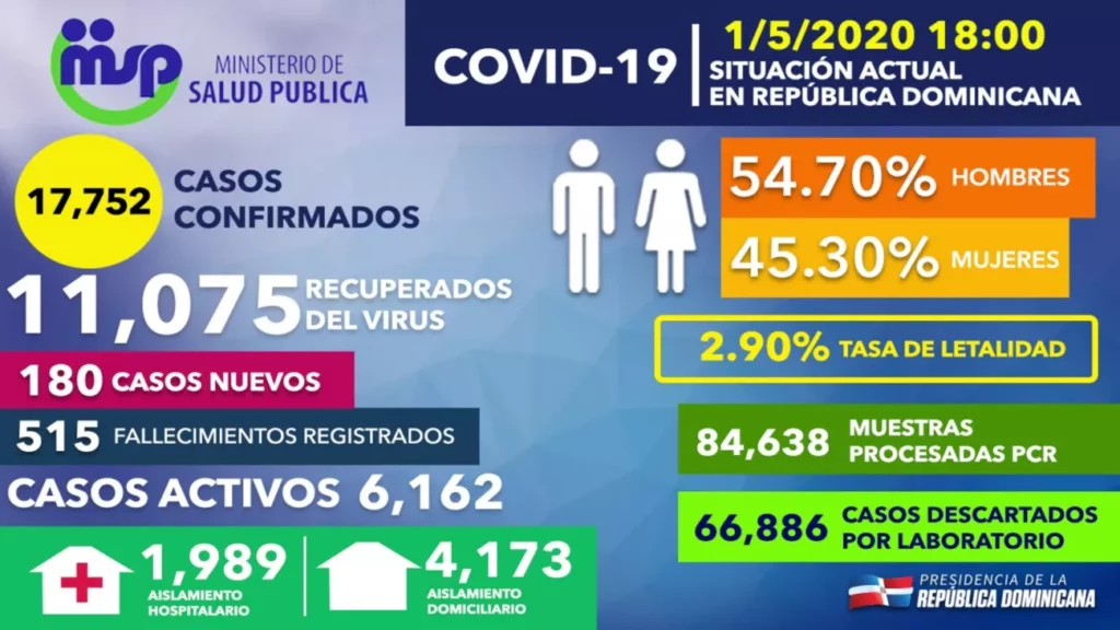 El informe, con corte al 01 de junio de 2020 a las 6:00 de la tarde, señala, además, 17,752 casos confirmados (180 nuevos), 515 fallecimientos (13 defunciones nuevas) para una letalidad de 2.90% y 66,886 casos descartados mediante pruebas PCR.
