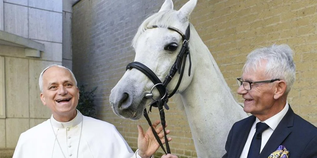 El caballo procede de los establos Michalski de Kolobrzeg-Budzistowo, en Polonia, y el papa lo recibió antes de celebrar la audiencia con visible alegría y lo tomó por las bridas para posar para las fotos.