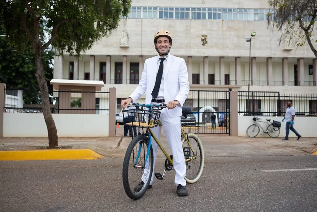 Santo Domingo.- Vestido de blanco, utilizando mascarilla propia del tiempo de pandemia y a bordo de su bicicleta, Mario Sosa llegó a juramentarse como regidor por la circunscripción 1 del Distrito Nacional.
