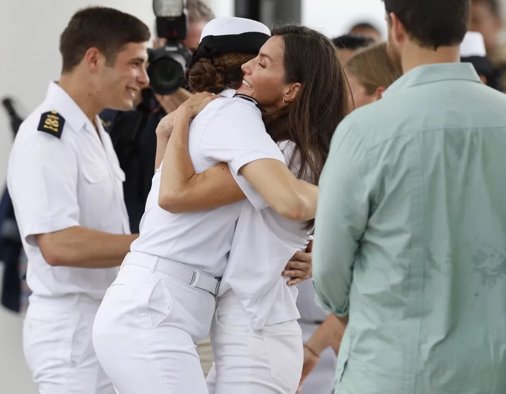 Al atracar descendió la princesa, que se dio un largo abrazo con su madre, y se mantuvieron juntas durante varios minutos, de la mano, abrazándose de nuevo, sonriendo.