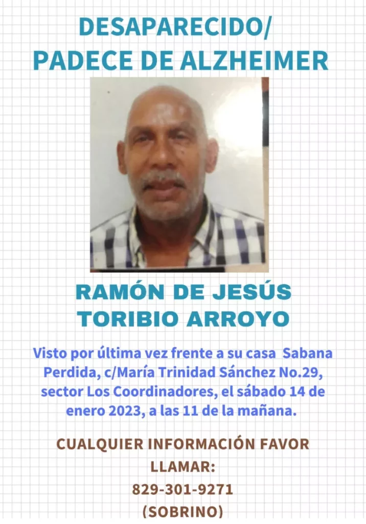 Se encuentra desaparecido el señor Ramon de Jesús Toribio Arroyo, quien fue visto por última vez el sábado 14 de enero frente a su residencia en Sabana Perdida, calle María Trinidad Sánchez, en el sector Los Coordinadores.