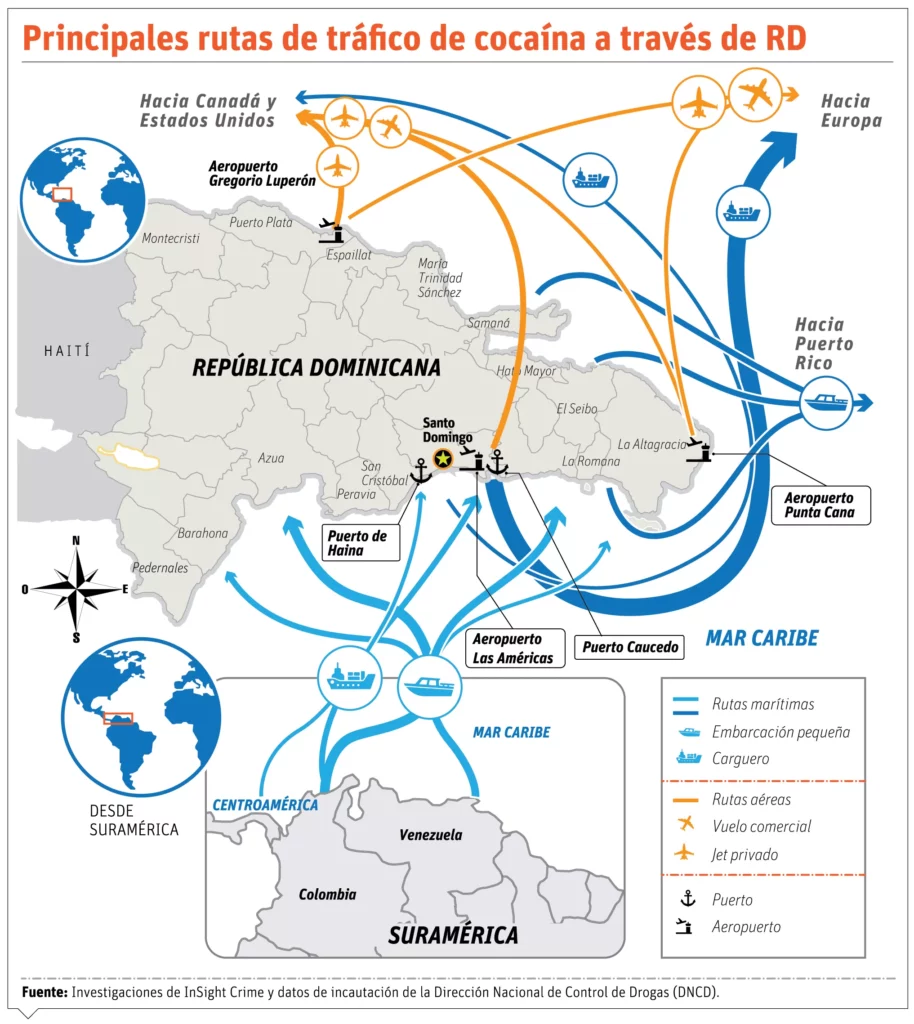 También se incautan regularmente cantidades considerables en vuelos comerciales y privados, y la mayor parte de la cocaína que se dirige a Estados Unidos se envía por mar desde la costa este de República Dominicana, atravesando el Canal de la Mona, hasta Puerto Rico.