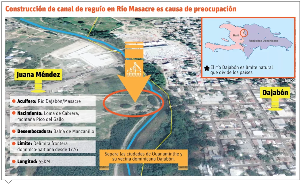 El canal en cuestión se está excavando a la altura de la ciudad de Ouanaminthe (Juana Méndez), limítrofe con Dajabón, municipio dominicano en el que existen tres canales de riego que sustraen aguas del Masacre.