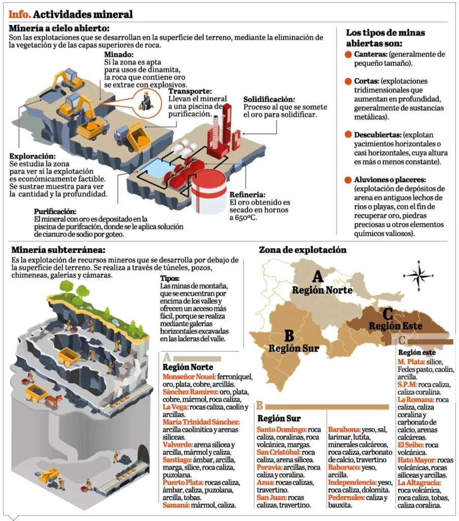 En la actualidad, 23 de las 32 provincias dominicanas tienen 120 minas. En 116 de ellas se extraen minerales no metálicos, mientras que las otras cuatro están autorizadas para que se explote oro, plata, cobre y níquel.