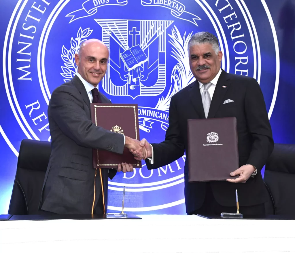 El ministro de Relaciones Exteriores, Miguel Vargas, y el embajador de España en el país, Alejandro Abellán García de Diego, suscribieron el convenio durante una ceremonia efectuada en el Centro de Convenciones de la Cancillería.