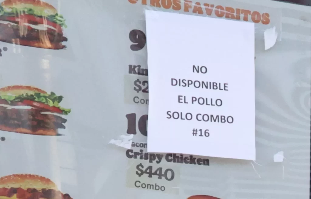 Santo Domingo.-El letrero ‘No disponible’ empieza a expandirse sobre las ofertas de productos a base de carnes de pollo que se sirven en las cadenas de comida rápida debido a las restricciones impuestas por República Dominicana a las importaciones desde Estados Unidos a los productos avícolas como medida por la aparición de gripe aviar en numerosos estados de ese país.