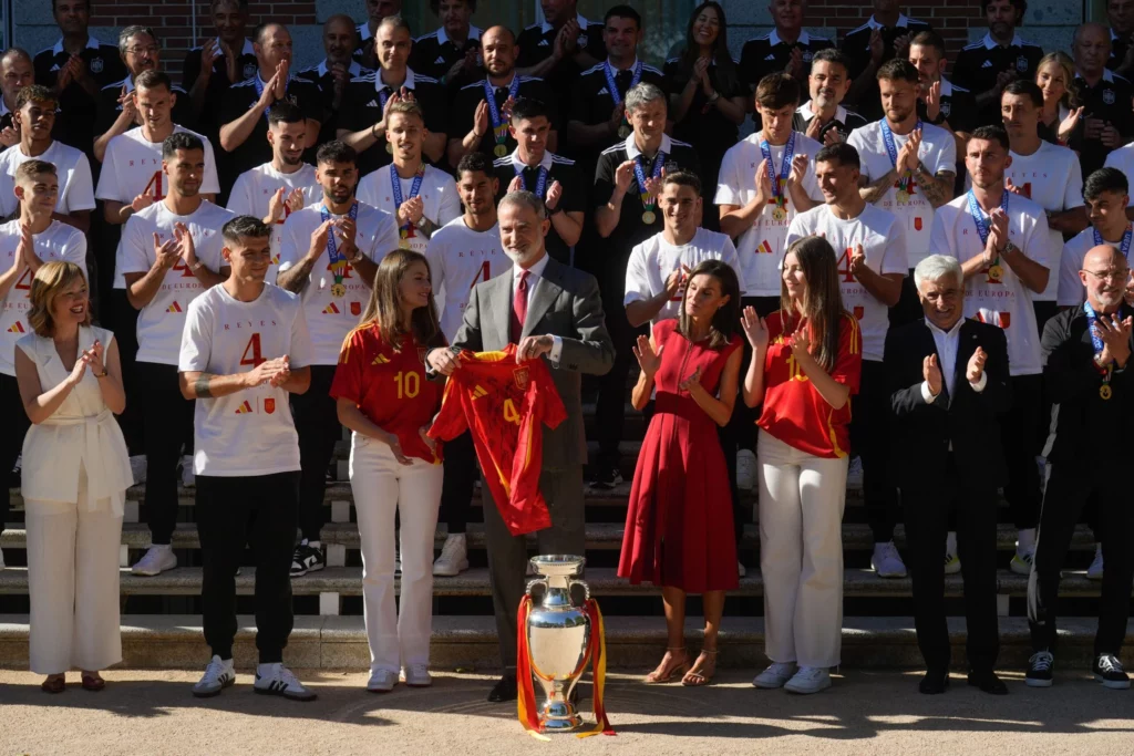 España.- Los reyes Felipe VI y Leticia, acompañados de sus hijas, la Princesa Leonor y la Infanta Sofía que, luciendo la camiseta con el número 10, recibieron ayer en el Palacio de la Zarzuela a la selección española de fútbol, a la que han felicitado tras conquistar este domingo el trofeo de la Eurocopa por cuarta vez en su historia, después de derrotar a Inglaterra 2-1.