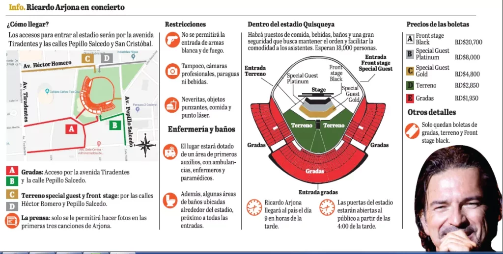 SANTO DOMINGO.-Otra vez Ricardo Arjona se apresta a hacer historia en la República Dominicana, confirmando que su liderazgo en el público criollo sigue siendo el mismo de años anteriores, pues la mayoría de las boletas ya se han agotado.