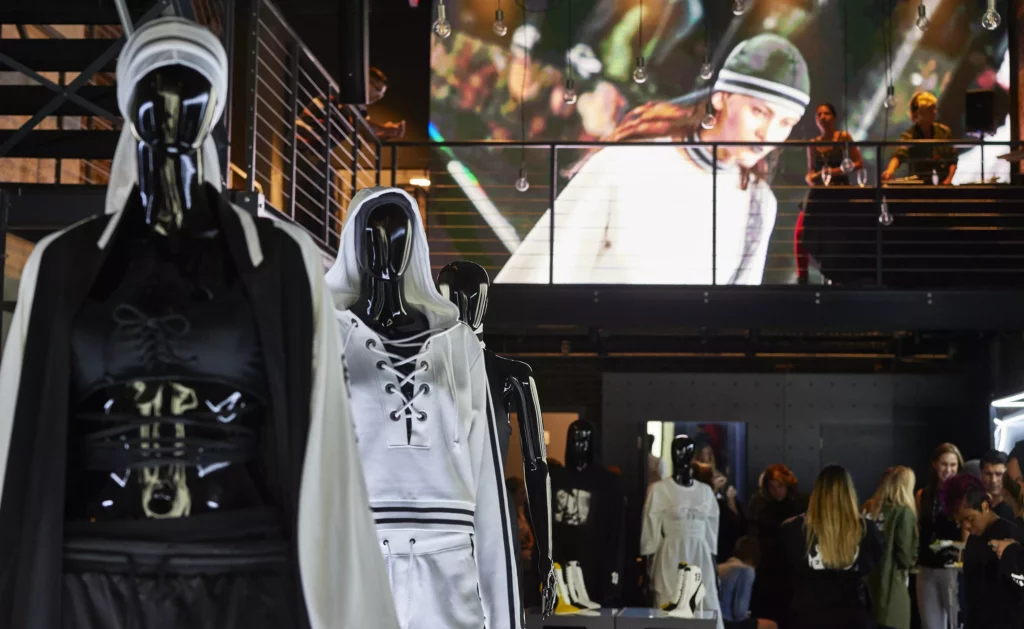 Su rompedora colección, la mayoría en blanco y negro, incluye sudaderas amplias y pantalones, vestidos, faldas, zapatillas y tenis de tacón.
