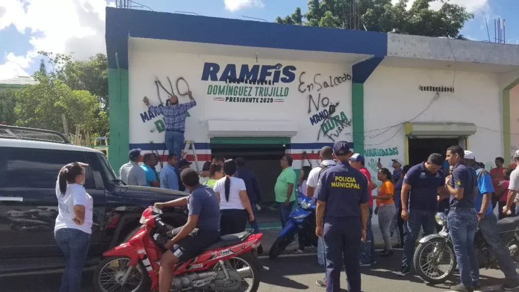 SANTO DOMINGO.- Bautista Rojas Gómez, miembro del Comité Político del Partido de la Liberación Dominicana y la alcaldesa de Salcedo, María Mercedes Ortíz, pintaron con spray negro un local de la candidatura de presidencial de Ramfis Domínguez Trujillo, nieto del dictador Rafael Leónidas Trujillo.