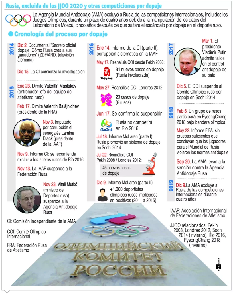 Cinco años después del escándalo del dopaje de Estado que sacudió los cimientos del deporte mundial, Rusia recibió ayer un castigo sin precedentes que la deja fuera de los Juegos de Tokio (2020) y de invierno de Pekín (2022).