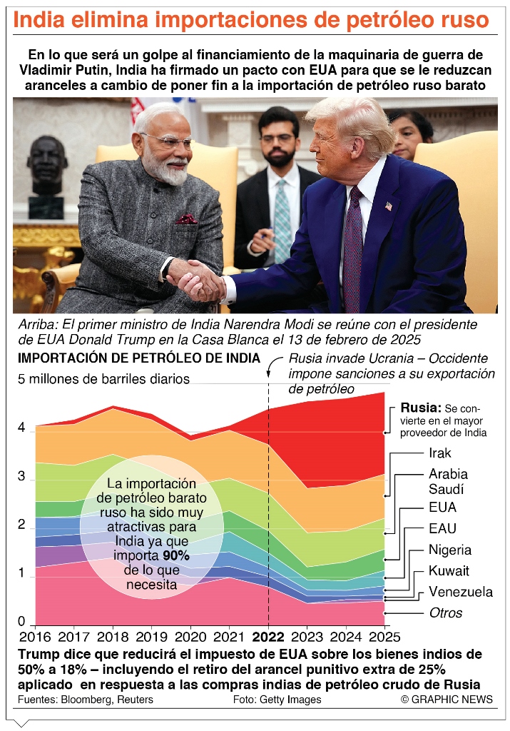 Según Trump, la India adquirirá a partir de ahora ese crudo de Estados Unidos y de Venezuela, cuyo sector petrolero se ha liberalizado desde la captura estadounidense de Nicolás Maduro hace un mes.