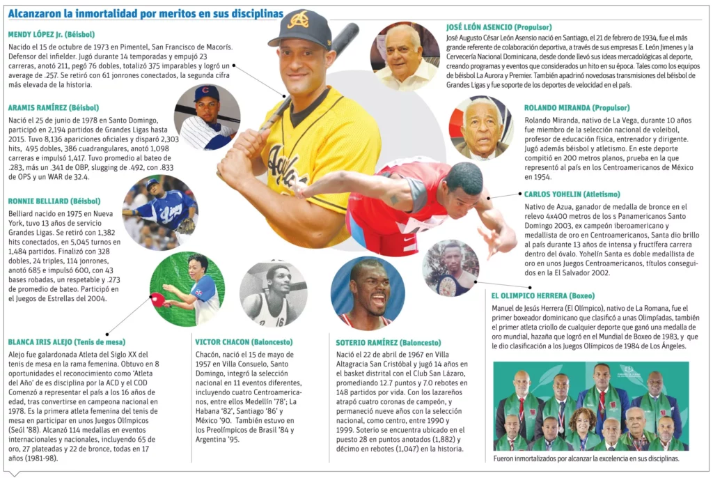 Los exbeisbolistas Aramis Ramírez, Mendy López Jr. y Ronnie Belliard, juntos a Blanca Iris Alejo (tenis de mesa), los exbaloncestistas Víctor Chacón y Soterio Ramírez, Carlos Yohelin Santa (Atletismo).
