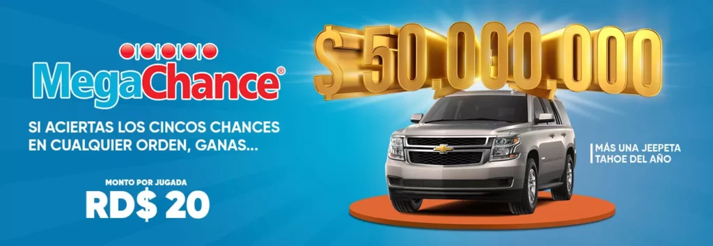 En su primera categoría de premio, el MegaChance oferta 50 millones de pesos y una jeepeta Tahoe del año, en la segunda categoría, 500,000 pesos, en la tercera 5,000 pesos y en la cuarta 100 pesos.