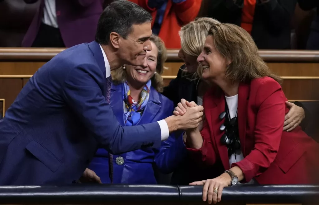 En una comparecencia sin preguntas, Sánchez explicó la composición oficial del nuevo Gabinete, compuesto por 22 ministerios, doce de ellos ocupados por mujeres, y cinco encabezados por miembros de la plataforma de izquierdas Sumar, principal nuevo socio del Ejecutivo.