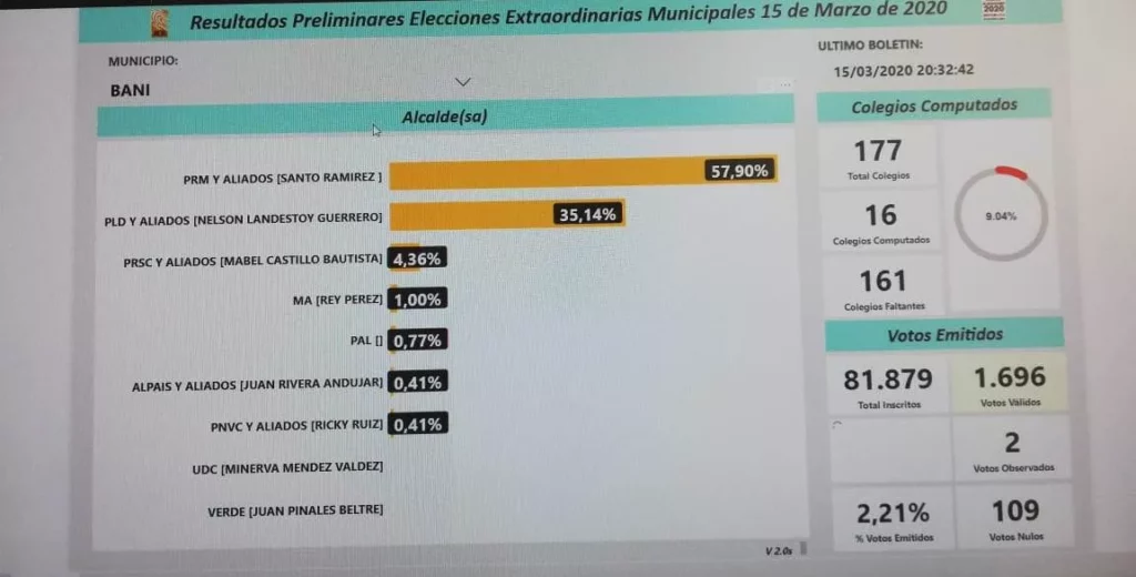 SANTO DOMINGO.- El candidato a alcalde de Bani, provincia Peravia, Santo Ramírez, lleva la delantera a su contendor del Partido de la Liberación Dominicana, Nelson Landestoy Guerrero, con un 57.90% frente a un 35.14%.