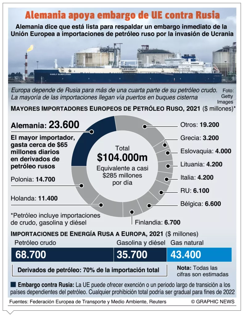 Los comisionados de la Unión Europea están debatiendo nuevas propuestas de sanciones, que podrían incluir un embargo gradual contra el petróleo ruso. Es probable que los 27 países miembros comiencen hoy a analizarlas, pero podrían pasar varios días antes de que las medidas entren en vigor.