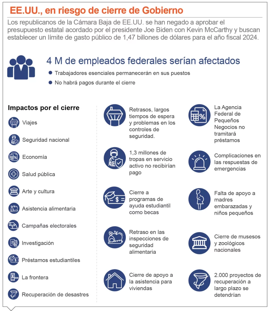 A esos republicanos no les gustó ese pacto y quieren más recortes. En concreto, buscan establecer un límite de gasto público de 1,47 billones de dólares para el año fiscal 2024, lo que supone 120.000 millones de dólares más en recortes de lo acordado.