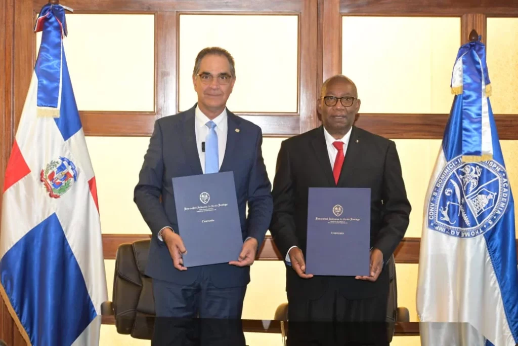 El convenio fue firmado por el rector de la Primada de América, maestro Editrudis Beltrán Crisóstomo y por el director ejecutivo del SeNaSa, doctor Santiago Hazim Albainy, en presencia de integrantes del Consejo Universitario y de una delegación de la citada aseguradora nacional.