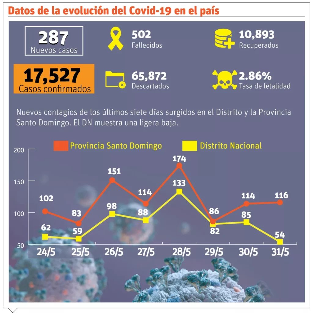 SANTO DOMINGO.-En la última semana el comportamiento del COVID-19 ha bajado la agresividad de su expansión en el país, lo cual se refleja en una ligera disminución de los contagios diarios, muy notorio en el Distrito Nacional que era la demarcación más contaminada.
