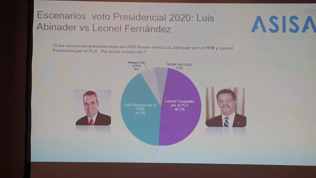 Santo Domingo.- Si las elecciones presidenciales fueran hoy un 48.2% votaría por Leonel Fernández, mientras que el 40.2% lo haría por Luis Abinader, según los resultados de la encuesta Asisa.