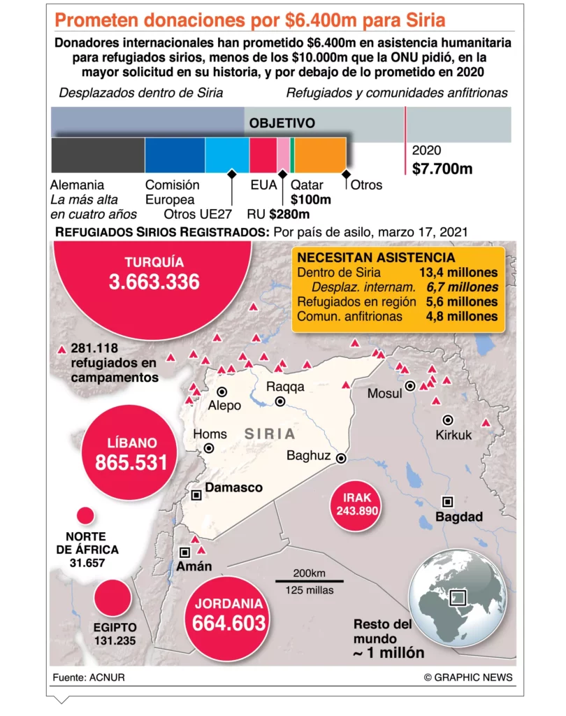 La comunidad internacional promete 5.300 millones de euros en apoyo a Siria. Del total hay 3.600 millones de euros corresponden a subvenciones para este mismo año y los otros 1.700 millones para el año 2022.