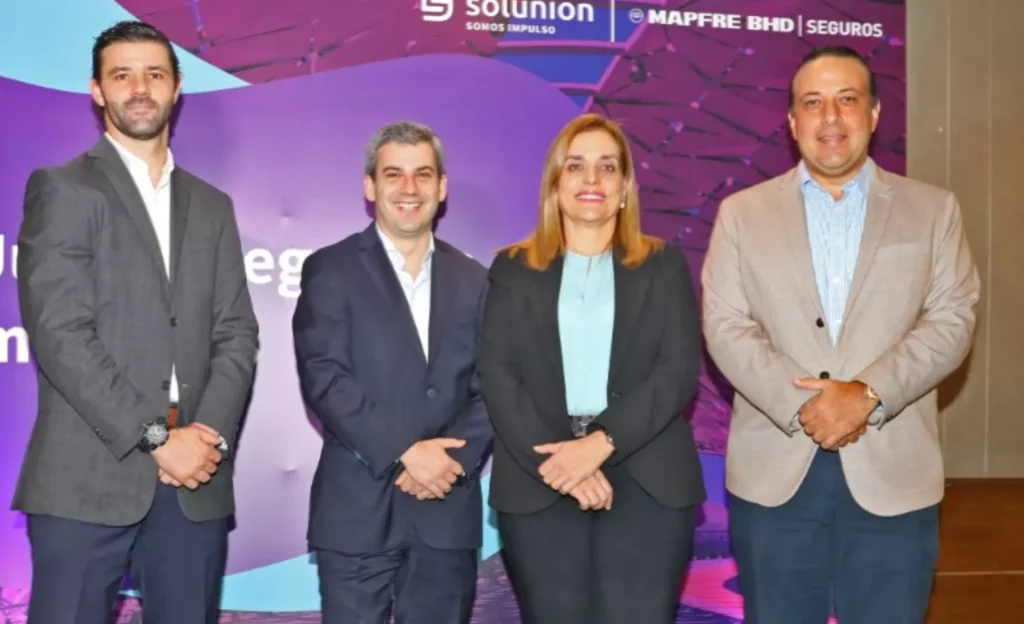 El evento estuvo presidido por Federico Pronzati, director Regional de Solunion para América Central y el Caribe; Pierina Pumarol, CEO de Mapfre BHD Seguros, y Julio Abreu, director general adjunto del Área Comercial de la aseguradora en el país.