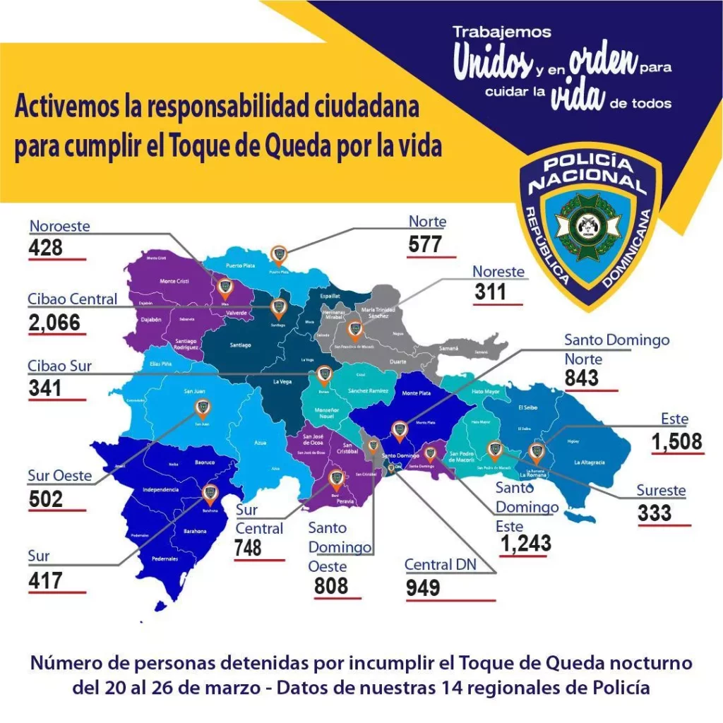 SANTO DOMINGO.- Durante la noche del jueves, 1,218 personas fueron detenidas por incumplir con el toque de queda establecido por el Poder Ejecutivo y que hoy inicia a partir de las 5:00 de la tarde.