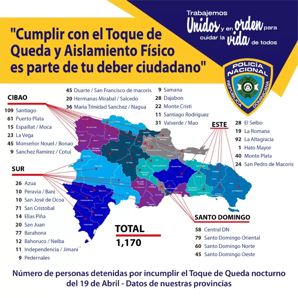 SANTO DOMINGO.-A un mes del inicio del toque de queda impuesto por las autoridades para contrarrestar la propagación del Coronavirus en el país, suman 44,021 ciudadanos detenidos por incumplir esa medida.