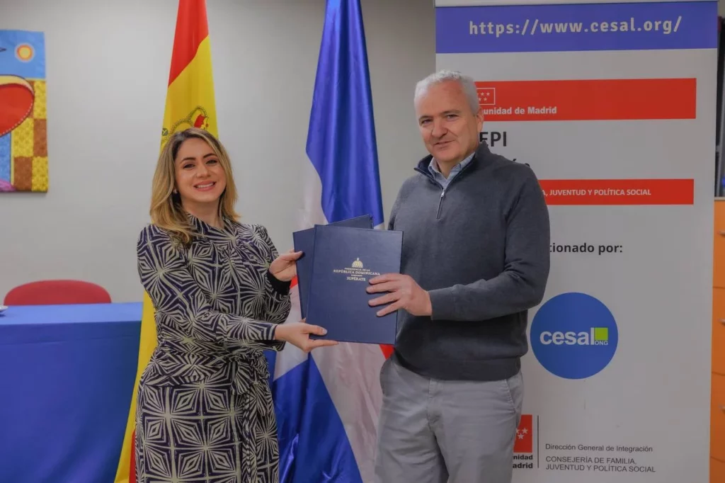 MADRID, ESPAÑA.- Gloria Reyes, directora general del programa social Supérate y Pablo Llano Torres, director de CESAL ONG en España, firmaron un convenio de colaboración, en el marco de la Feria Internacional de Turismo (FITUR) 2024, para crear el primer Restaurante-Escuela en Pedernales, como parte de la estrategia del estado dominicano para el desarrollo turístico de la provincia sureña.