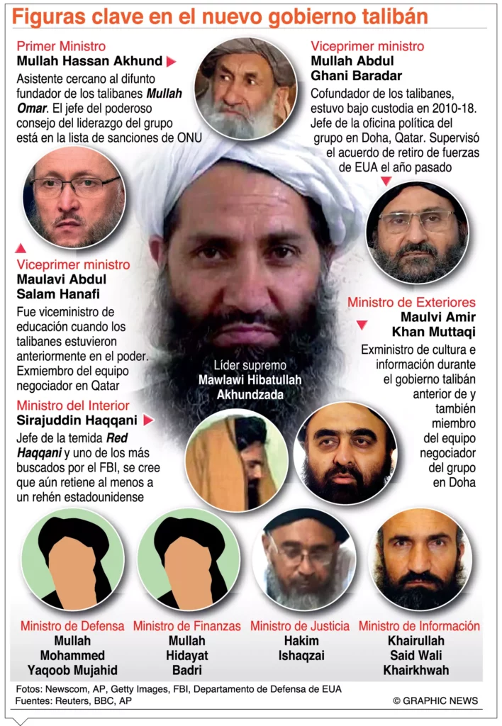 El primer ministro interino Mullah Hasan Akhund encabezó el gobierno talibán en Kabul. En el gabinete también estará el mulá Abdul Ghani Baradar, quien firmó el acuerdo que llevó a la retirada final de Estados Unidos de Afganistán. No había indicios de no talibanes en los nombramientos, una gran demanda de la comunidad internacional.