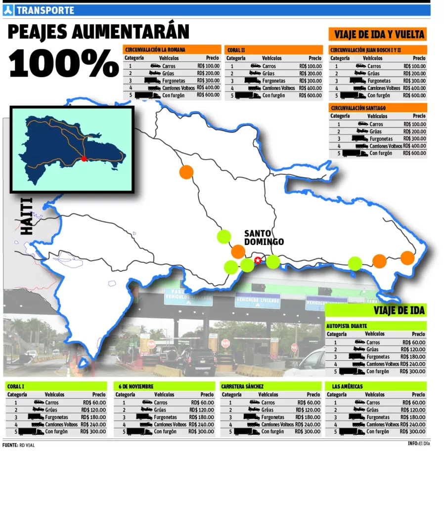 Santo Domingo.-A partir de hoy cada carro que cruce las estaciones de peaje de las autopistas las Américas, Duarte, Sánchez, 6 de Noviembre y Coral I tendrán que pagar RD$60 pesos, debido al aumento del 100 % de la tarifa vigente desde el año 2002.