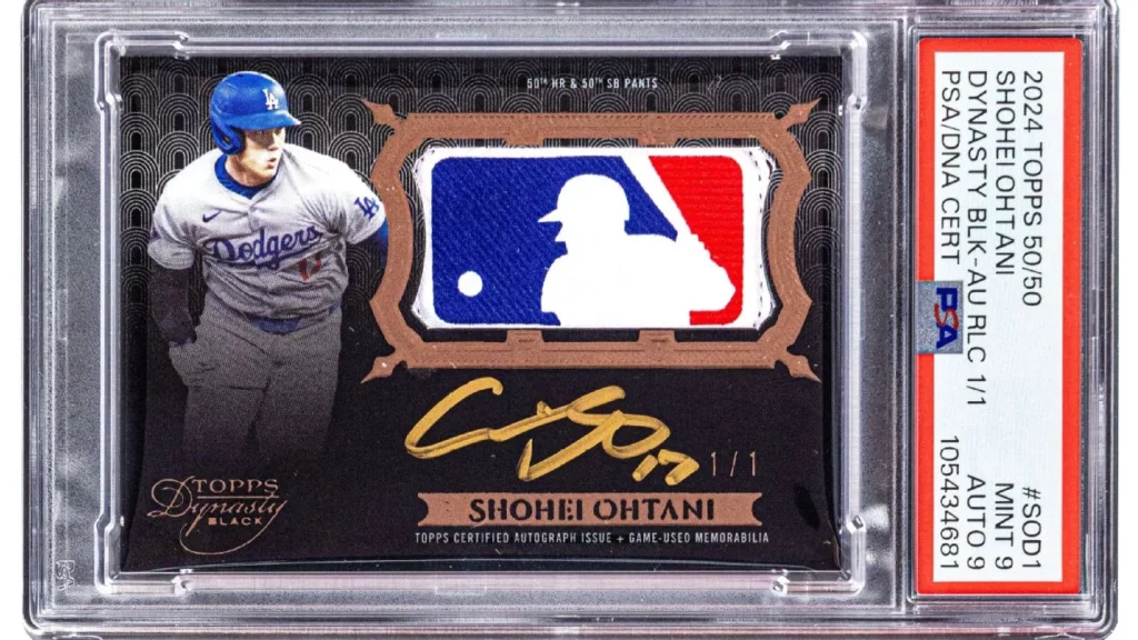 La venta de la tarjeta de Ohtani, autografiada y numerada 1 de 1, presenta el logo de las Grandes Ligas de Béisbol de los pantalones que usó en septiembre de 2024 al conectar sus jonrones 49, 50 y 51, y al robar sus bases 50 y 51 contra los Miami Marlins. Se vendió por 1.067 millones de dólares en Heritage Auctions, incluyendo la prima del comprador, y es, por mucho, la tarjeta de Ohtani más cara.