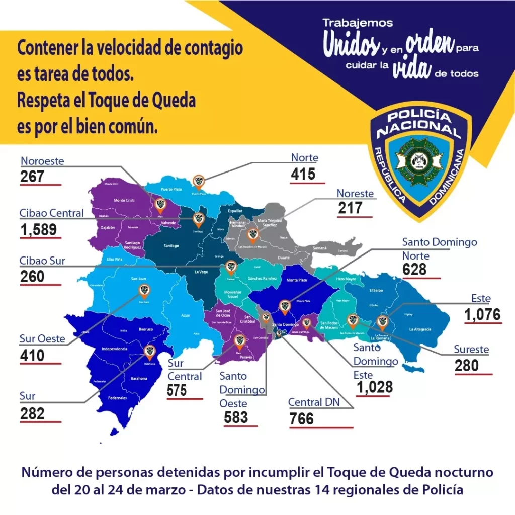 A través de un comunicado, la uniformada precisó que las regiones con mayor número de apresamientos siguen siendo Santiago de Los Caballeros, La Romana, Santo Domingo Este y el Distrito Nacional se presentan diariamente entre 100 a 300 detenidos por violar el Toque de Queda.