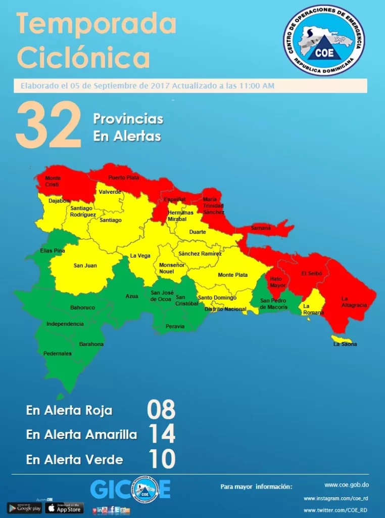 Santo Domingo.- El Centro de Operaciones de Emergencias (COE) emitió hoy alerta para todo el país, debido al paso del huracán Irma, de categoría 5 y con vientos máximos sostenidos a 180 millas por hora (285 km/h).