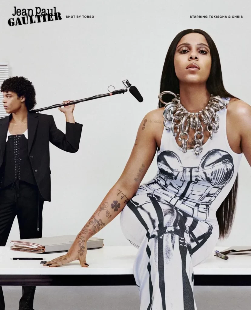 Très Gaultier reúne a la dominicana Tokischa y a la modelo Amelia Grey en un mismo escenario. La grabación visual fue realizada en la Casa de Gaultier en la Calle Saint Martin 325 en París.