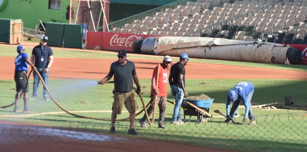 SANTO DOMINGO.-Trabajadores dominicanos en jornada extendida en el terreno del estadio Qusiqueya, ayudados por los visores ‘gringos´ que no dudan en agarrar la manguera u otra herramienta para predicar con el ejemplo.