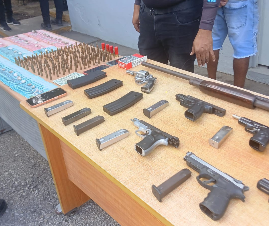 En las viviendas intervenidas, las autoridades incautaron seis pistolas de distintos calibres, un revólver .357, una escopeta calibre 12, tres cargadores para fusil 5.56, 173 municiones de diversos calibres, un cargador con capacidad para 26 balas, tres celulares y dinero en efectivo aún no contabilizado.