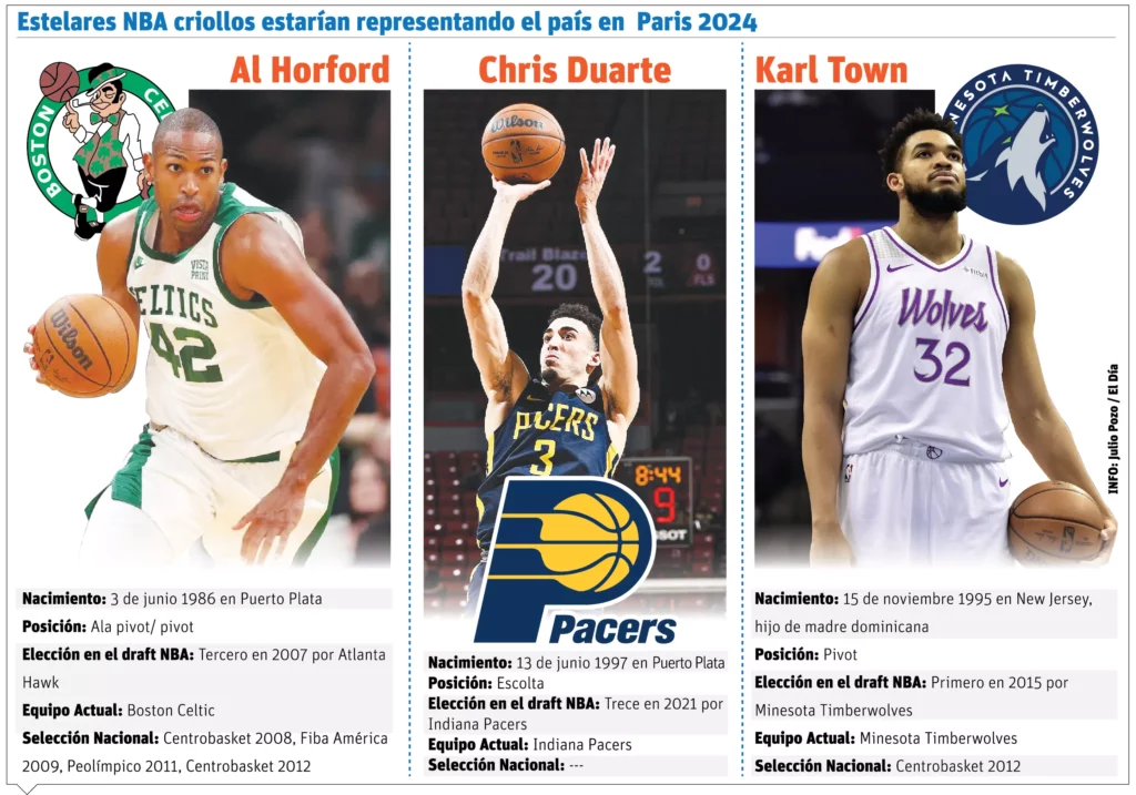 El también puertoplateño Al Horford le comunicó al presidente de la Federación Dominicana de Bolencesto, Rafael Uribe, su intención de integrarse al seleccionado para este ciclo olímpico, mientras que Karl Town dijo públicamente que volverá a vestir la casada tricolor.